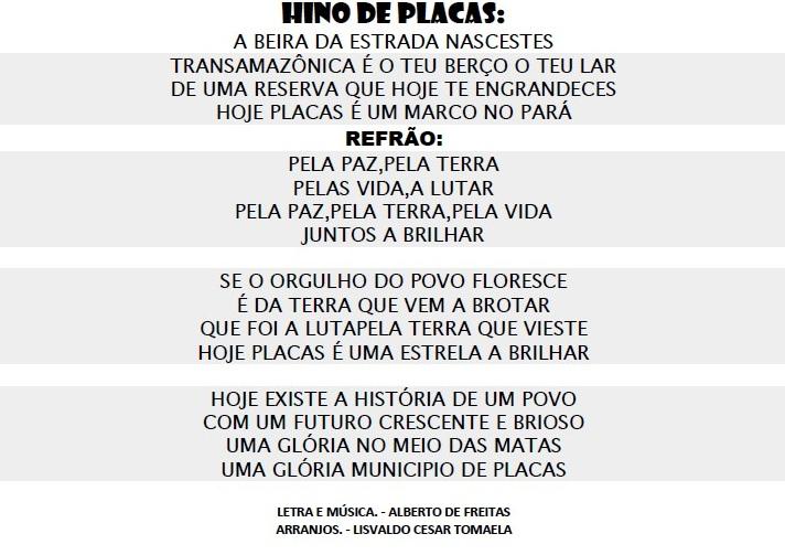 A bandeira o hino e o brasão de Placas foram criadas em um concurso público realizado no dia 13 de julho de 1999. O autor do hino e da bandeira é o mesmo:Luiz Alberto de Freitas .O autor do brasão é o senhor:SARAIVA cidadão residente no município de Rurópolis.O Hino de Placas original do concurso teve de passar por alguns arranjos para ser adaptado a nossa realidade,oque foi efetuado pelo ProfºLisvaldo César,com a autorização do autor e da,então,Secretária de Educação Profª Maria Jose Andreatta.